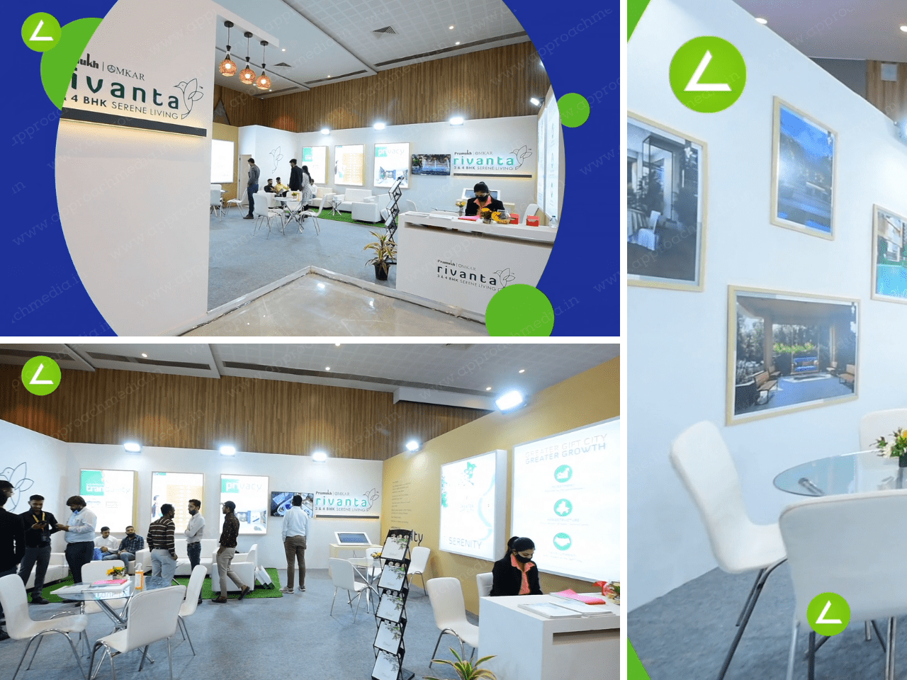 The Omkar Group’s design aim was to create a distinctive environment that highlighted the company’s rising presence, resources, and dedication to real estate development. Several factors collaborated to achieve this broad purpose. All adjustments will be done in accordance with Omkar’s brand Riventa. The construction of the booth would have to strike a balance between solidity and creativity, being both robust and rhythmical. Nayan Dhameliya, the project’s principal exhibit designer, was inspired by the simple and Omkar Group simplicity style, while also including extremely basic components to emphasize the company’s connection to AMPL. Omkar’s show would stand out with its innovative style tempered by natural elements. Omkar’s team required great visibility on the exhibition floor, casual and formal meeting areas, and a message area for various levels of involvement.