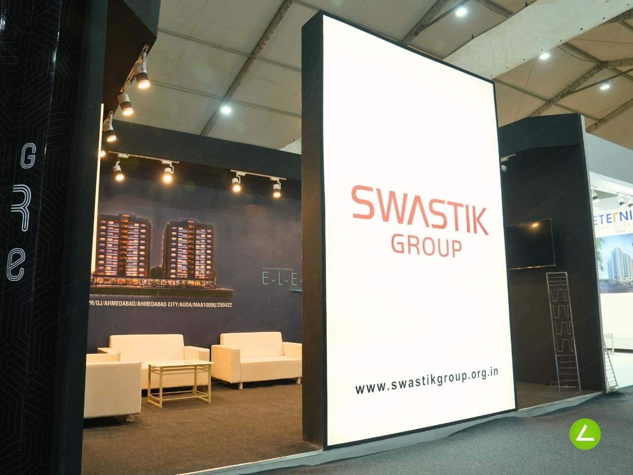 The stall design prominently featured the Swastik Group’s logo, strategically positioned to instantly capture attention and reinforce the brand identity. The large 12×8-foot illuminated logo, set against the black backdrop, stood out prominently and made a lasting impression. This visual element enhanced brand recognition and communicated Swastik Group’s commitment to excellence and reliability.